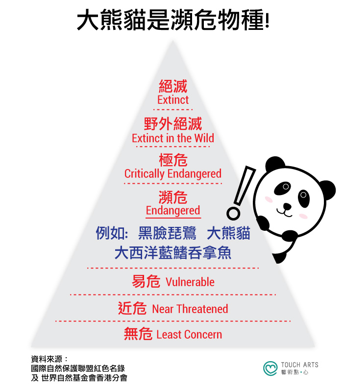 專責野生動物管理的國際自然保護聯盟將大熊貓定為「瀕危」(Endangered)級別,僅次於「極危」(Critically Endangered)。與大熊貓同屬「瀕危」級別的黑臉琵鷺,亦曾一度屬「極危」,代表牠們面臨絕種的威脅。梁恩銘說:「黑臉琵鷺在中國沿岸生活和遷徙,過去數十年中國沿岸有很多發展工程,令牠們的棲息地受破壞,導致牠們的數量減少。幸好近年牠們的數量開始回升,現在已超過1700隻,甚至接近2000隻,所以黑臉琵鷺已由「極危」下調至「瀕危」級別。不過這不代表牠們不再受威脅,牠們仍然會受發展、污染等問題所影響。」